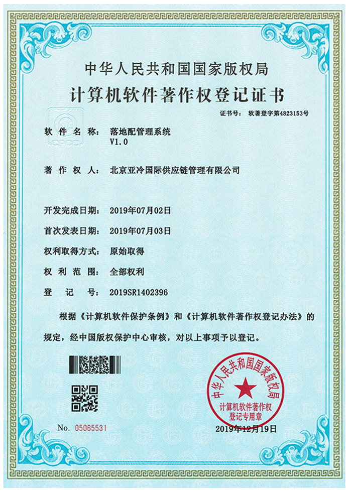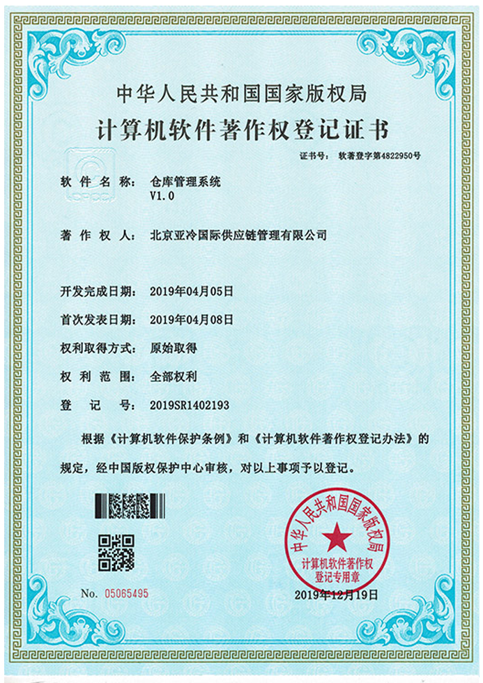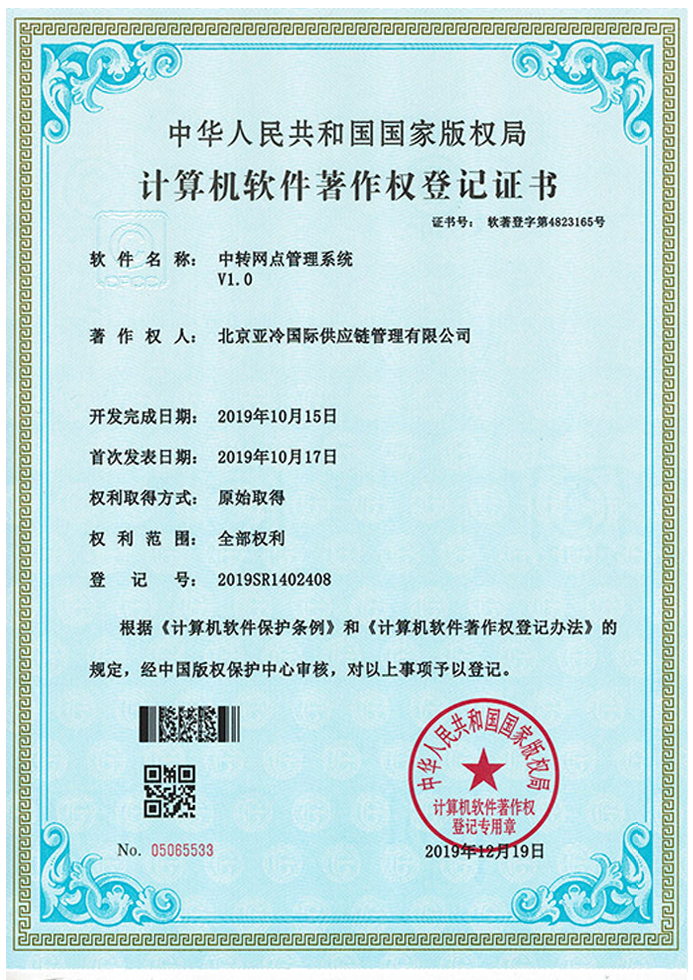 冷鏈客戶(hù)管理體系統(tǒng)軟件著作權(quán)登記證書(shū)