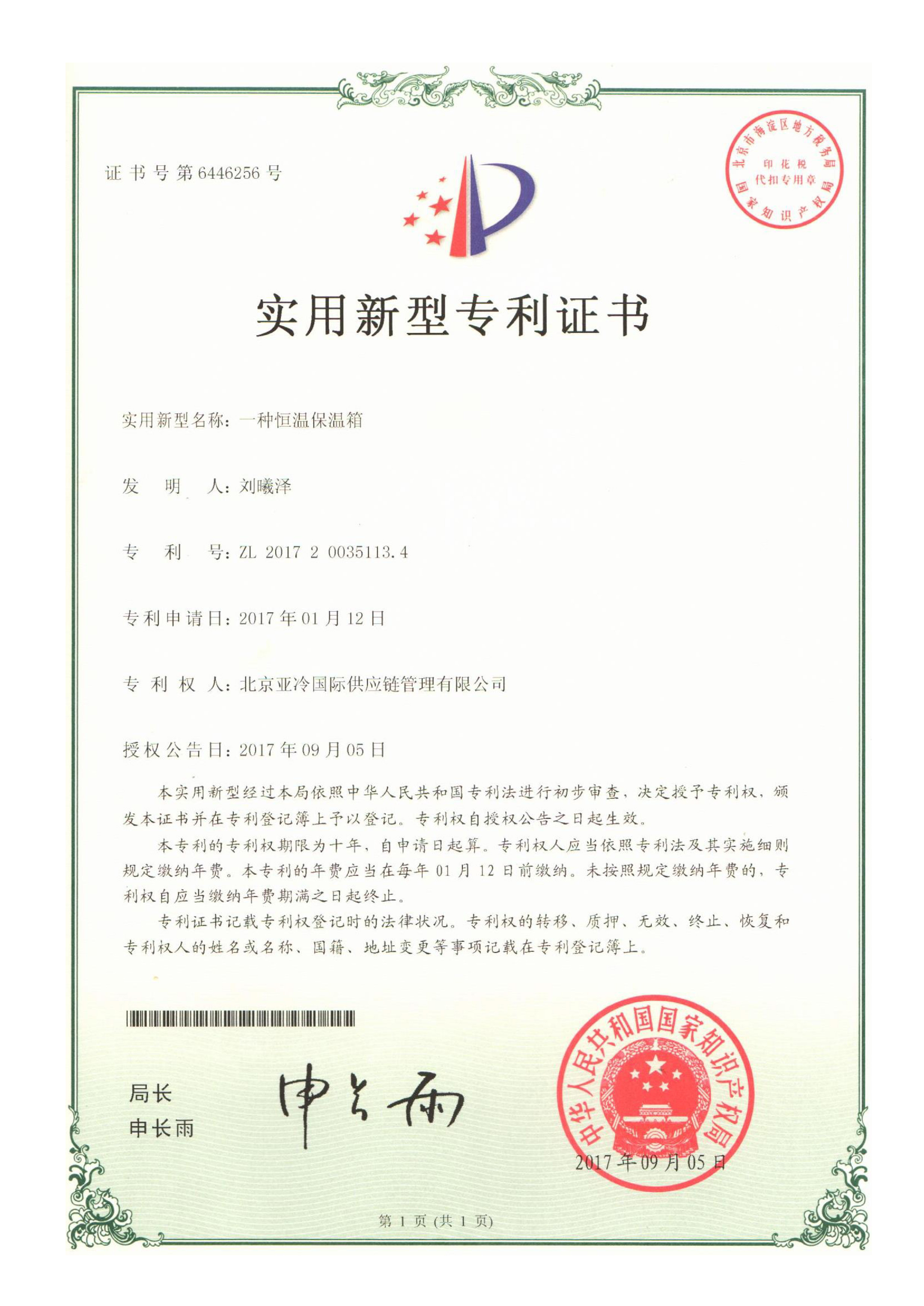 實(shí)用新型專(zhuān)利證書(shū) 恒溫保溫箱