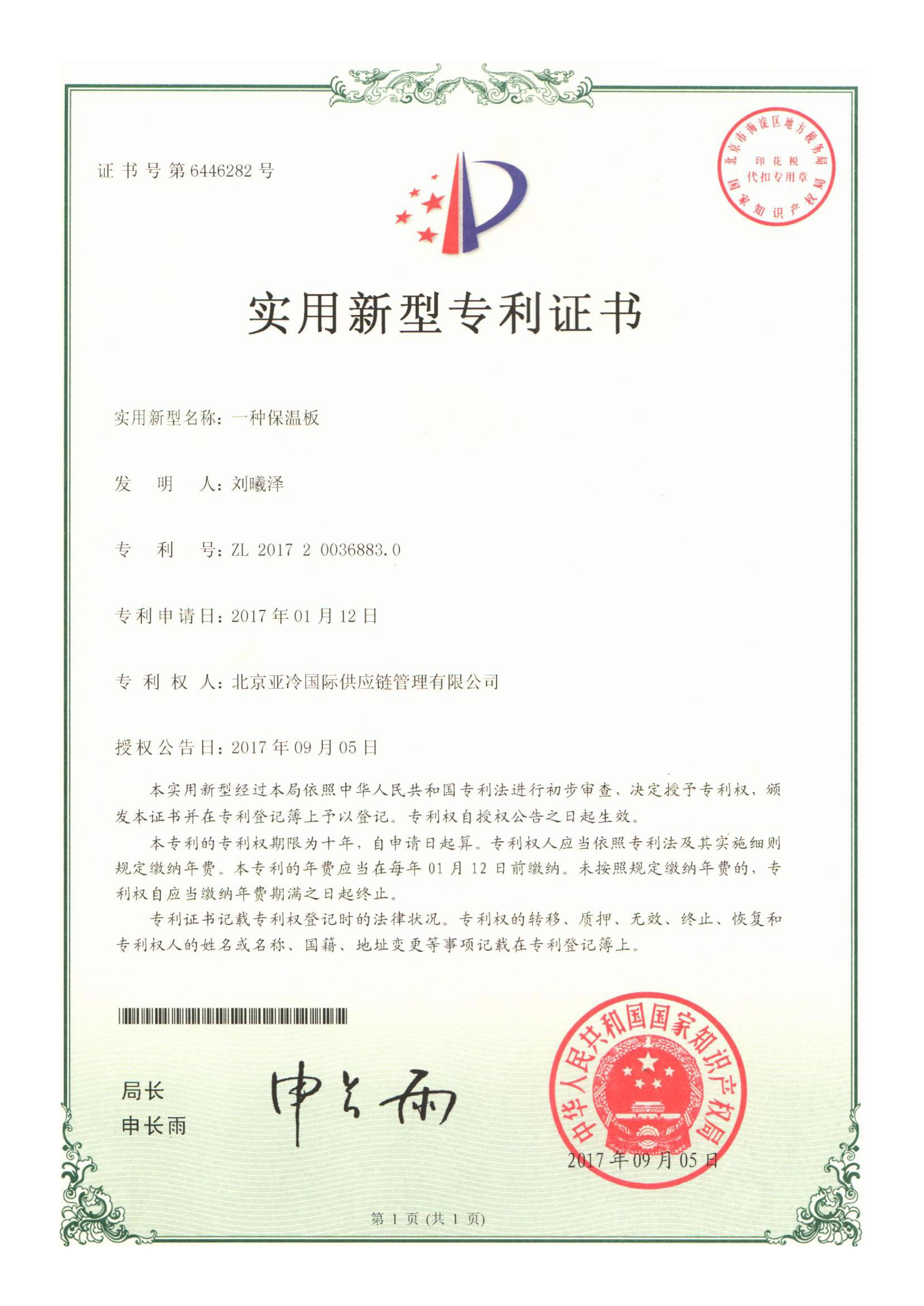 實(shí)用新型專(zhuān)利證書(shū) 冷鏈物流運(yùn)輸設(shè)備