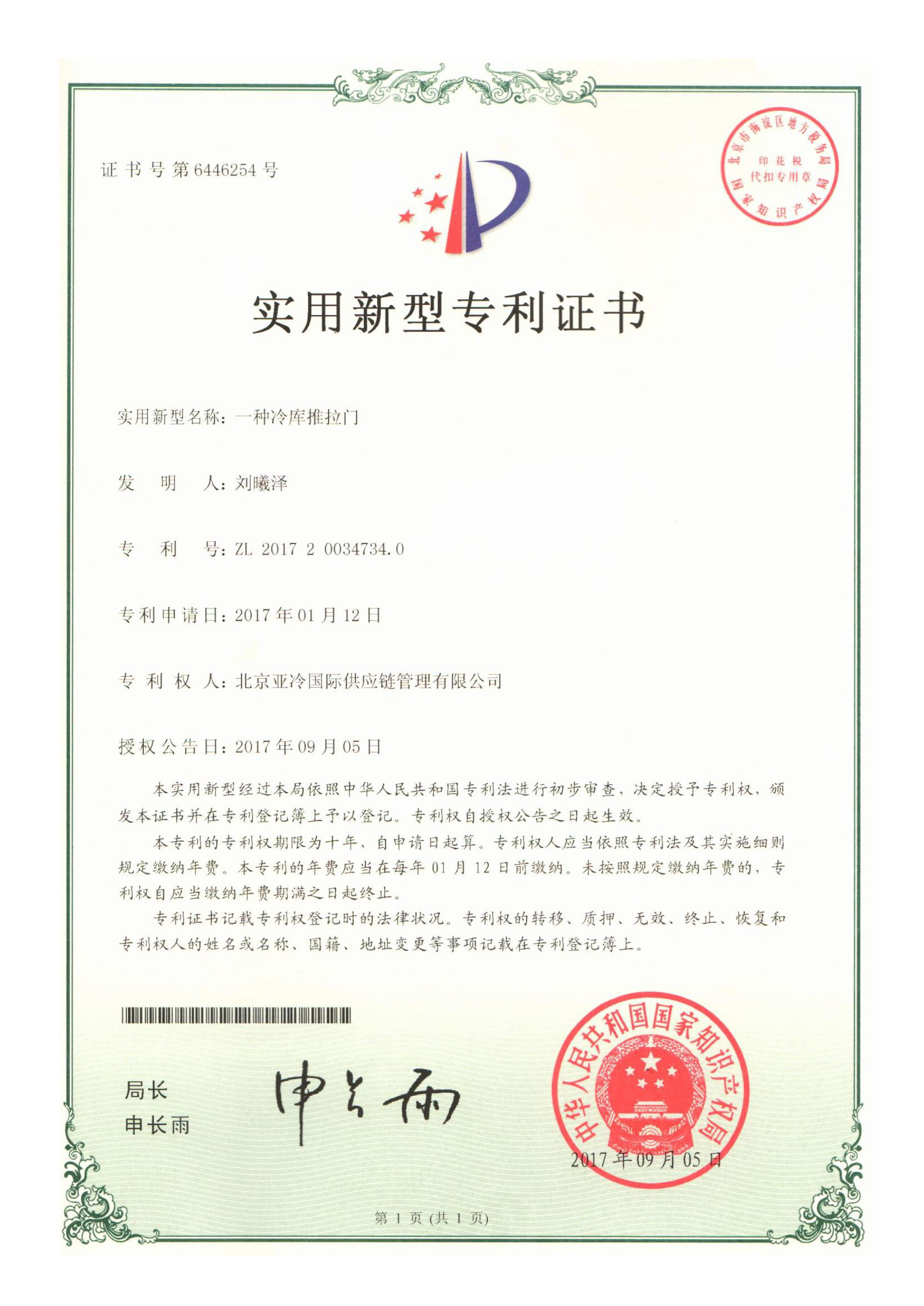 實(shí)用新型專(zhuān)利證書(shū) 冷庫(kù)推拉門(mén)